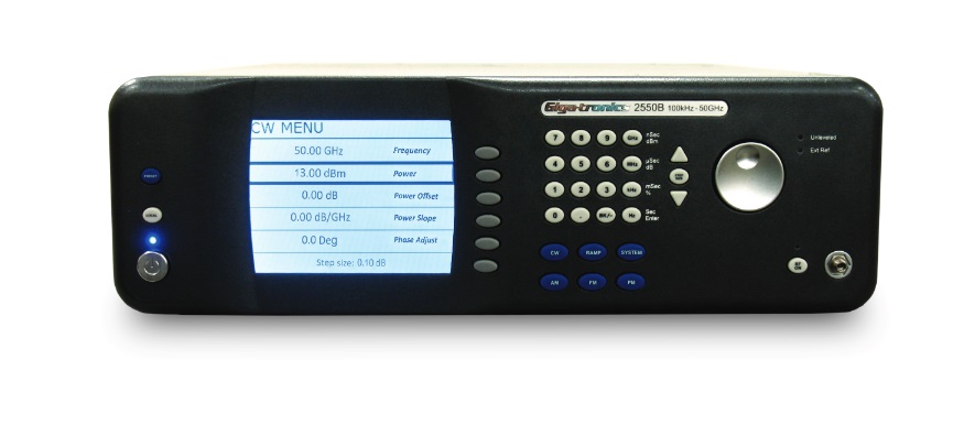 The 2550B Microwave Signal Generator is a high-performance CW and swept frequency signal source covering the frequency range of 100 kHz to 50 GHz, with high signal purity, high output power, fast frequency switching speed and a full suite of analog modulation capability.  The 2550B Microwave Signal Generator features high time base stability, frequency resolution of 0.001 Hz and ultra-low phase noise, harmonics and spurious for applications requiring clean pure signals. Modulation capability includes amplitude modulation (AM), frequency modulation (FM), phase modulation and high-speed pulse modulation (PM) with pulse width as low as 10 ns. Remote programming capability is over GPIB (IEEE-488) or Ethernet LAN.