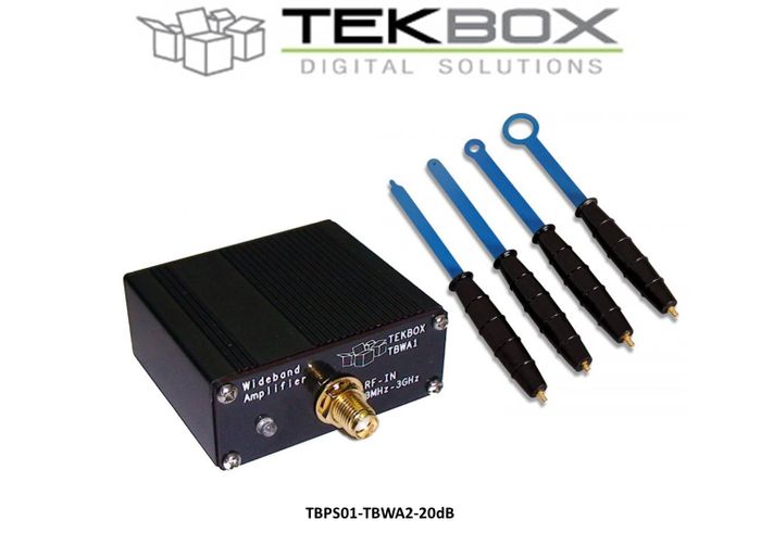 TekBox EMC Probe Set and TBWA2-20dB Wideband Amplifier in a wooden box