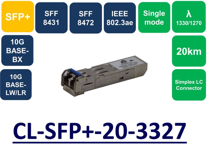 Features: SFP+, 1330/1270nm, Single Mode, Bi-Directional WDM, 10Gb/s, 10GBASE-BX, 10GBASE-LR/LW, Up to 11.1Gbps Data links, Compliant with SFF-8472, Compliant to SFF-8431, Compliant to 802.3ae 10GBASE-LR/LW, Hot Pluggable, Simplex LC Connector, 20km, 1 year warranty