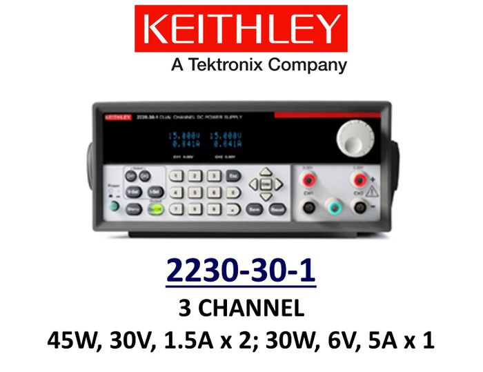Keithley 2230-30-1 benchtop linear power supply, 2x45w 30v 1.5A, 1x30w 6v 1.5A, low noise, prog.